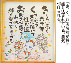 ▼大切な人が還暦を迎えたとしよう。さて、贈り物は何にしようか。そうだ、ネットで調べてみよう。そうして出会ったのが、「花なまえの詩」だ。三好店長の担当は、ショップ運営・筆文字・名前の詩の創作・メールのやりとり。趣味のママさんバレーでは全国大会を目指している。2007年から参加したスタッフの新宮さやかさんは、名前の詩の創作・メールを担当し、京都の清水で陶芸の勉強をしている。川端千恵さんは参加して1年になる。イラストの制作を担当、大学では日本画を専攻し、今は大阪の植物園で花のスケッチをするのが趣味だそうだ。残るスタッフは三好史郎さんだ。自己紹介によると「こんにちは。店員の三好です。店長に家庭では尻に敷かれ、仕事場ではあごで使われています」。微笑ましい限りだ。担当はイラスト・Web制作・雑務全般。尊敬する人は稲尾和久だ。突然の訃報に泣いたという。 ▼この4人が世界でたった一枚の額絵を作ってくれた。「きくお」という名前とプロフィールを書いて、工房にメールする。満足のいくまでやり取りしながら、創りこむ。そしてできた。