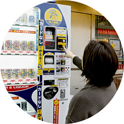 「TASPO」の登場で一般的になった成人識別装置搭載の自動販売機。最近では、ICカードではなく、人の「顔」で年齢を識別する顔認証モデルが街に増えてきた。利用者の目や口の配置、骨格などで年代層を導き出し、成人か否かを判断する。自販機メーカーのフジタカは、2007年に顔認証装置付きモデルを商品化、すでに全国で200台以上を設置したという。日本自動販売機工業会の調べによると、国内の全自動販売機台数は約550万台。そのうち、酒類の自動販売機が8万5000台程度で、たばこが62万5000台ほどという。ICカードで識別する方法に比べ、カードを携帯しなくていいので、利便性が高い。