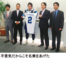 ▼エレコムは4月14日、大阪本社会議室で記者会見を開いた。久しぶりに、記者会見への出席を本紙編集部から依頼され、わくわく気分で参加した。エレコムは4月から神戸のアメフトチーム「神戸ファイニーズ」のメインスポンサーになった。神戸ファイニーズは1975年に発足。現在の登録選手は60名、チアリーダー9名、キッズチアスクール会員202名を擁する。「2012年のライスボールを制覇して日本一を目指す」と、会見でチームリーダーが宣言した。頼もしい限りだ。事を起こすには理由がある。会見の答弁から、それらを拾ってみると――。上場企業として、社会貢献の一環としての活動を行う。もっともな理由だ。社員にアメフトの経験者が何人もいて、そのなかの一人がこのチームに所属していたのが縁だという。昨年末の忘年会のときに、「社員からスポンサー探しの話が出ましてね。僕は神戸育ちですし、“ご縁”を大切にしますから」ということだ。ほんとのような、そうでもないような話が、葉田さんらしいのだ。