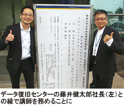▼「僕は年の初めに、五つのやりたいことを、トイレに書いて貼ります。こうしておくと、叶うんです」。叶うように考え続ける毎日だ。私との出会いもそのうちの一つだったのかもしれない。事実、こうして二人して、熊本大学大学院生に話をしている。さまざまな先達が活動して、デジタル社会の夜が明けた。若者に伝えることは山ほどある。講演が終わって学生たちと語らった。熱かった。起業家になるのはごく一部の人だと思う。そのわずかな人たちに熱い思いを語り継ぐべきだと思った。 (BCN社長・奥田喜久男)