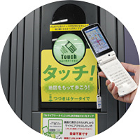 JR山手線の主要駅には、駅周辺案内図と連動した携帯電話向けシステム「ナビタッチ」が設置されている(写真は秋葉原駅)。おサイフケータイ対応携帯電話で「ナビタッチ」の読み取り部にタッチすると、駅周辺の地図情報が取得できる。また、ICカード「Suica」を利用したポスター「Suipo」とも連携しており、Suicaやパスモなどと携帯電話のメールアドレスを登録しておくと、メールで地図情報が受け取れる仕組みにもなっている。「ナビタッチ」は、表示灯とJR東日本企画の2社がサービスとして提供しているもので、乗降客に対する付加価値サービスの提供が狙い。