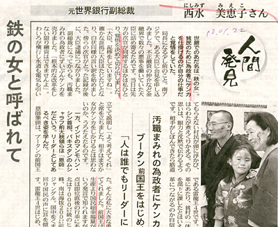 【本郷発】最近、日経新聞の記事で素晴らしい人を知った。西水美恵子さんである。元世界銀行副総裁の肩書きの方だ。この人の名前は日経で読むまで知らなかった。『人間発見』という人物連載で、1月22日号が西水さんのシリーズ最終回の記事だった。