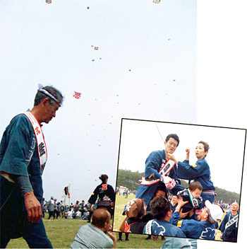 子供の誕生を祝って、町内が凧を揚げてくれる
