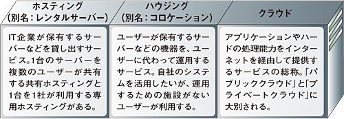 データセンターを活用して提供されるサービスはさまざまだが、大別すると三つに分かれる。(1)ホスティング、(2)ハウジング、(3)クラウドがそれだ。ホスティングはIT企業が保有するデータセンター内にある情報システム機器の機能をインターネットを通じてユーザーに貸し出す。ハウジングはユーザー企業がもつ機器をIT事業者が自社のデータセンターで預かって運用を代行するサービス。最後がクラウドで、アプリケーションや情報システムの機能を個別に貸し出すサービスを指す。