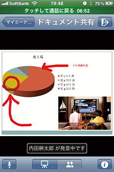 藤生氏は展示会など、遠方に外出していて、会議に間に合わないときなどに、この「WebEX」にアクセスし、資料を共有しながらその場でミーティングに参加するという。「非常に役立つツール。遠くの風の音まで入ってしまう場合があるほど、音がとてもクリア。iPhoneで表示した資料を見ながら接続マイクを通して会話するので、周りの人から変な人と見られるかもしれない」と笑う。iPhone 4を使えば、画面側にレンズが付いているので、顔を写すこともできるそうだ。