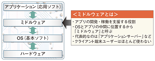 ミドルウェアというのは聞き慣れないIT用語で、その機能をイメージしにくい。それは、IT企業や情報システム管理者が活用するケースが大半で、PCなどのクライアント端末を利用するユーザーが、ミドルウェアを活用するケースはほとんどないからだ。