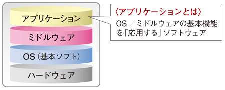 ソフトウェアは、大別すると(1)OS(基本ソフト)、(2)ミドルウェア、(3)アプリケーションソフトの3種類に分けることができる。OSはアプリケーションの開発・稼働に必要な基本機能だけをもったソフトで、ミドルウェアはOSにはない複数のソフトに活用できる汎用的な機能をもち、アプリの開発・稼働を中間(ミドル)層でサポートするソフトである。また、アプリは特定の作業を行うためだけに開発されており、基本機能を「応用する」という意味の英語でアプリケーションと呼ばれる。