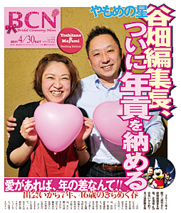 ▼題字はいつもどおりのBCNですが、中身は『Bridal Ceremony News』。通巻はvol.1122で“いいふうふ”。なんだか出来すぎです。見出しが振るっています。「谷畑編集長、ついに年貢を納める」。46歳にして32歳の新婦が伴侶となりました。サブ見出しは「愛があれば、年の差なんて!!」という、わかったようでそうでもないようなシロモノで、還暦過ぎの編集経験者としては、「愛と年齢の相関関係を論ぜよ」などと、いちゃもんをつけたくもなります。