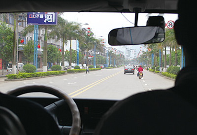 タクシーの車内から見た憑祥市の街並み。整然としてきれいだ