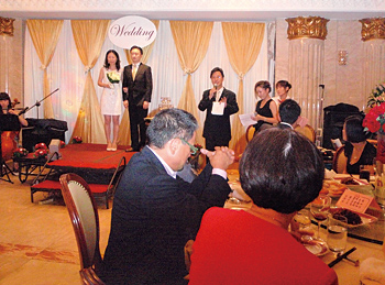▼上海の交通は終日混雑が続く。約束した時刻通りの訪問はなかなか難しい。結婚式も同様で、招待者は三々五々集まってくる。八割方集まったかなというところで、20分遅れで新郎新婦の入場だ。司会者の話が始まった。新郎新婦が指輪を交換する。誓いの言葉を双方で交わす。次いで、「それでは愛の接吻を」となる。アンコールがあって、会場は大いに沸いた。祝いの光景はいつどこで見てもいいものだ。皆が思い思いに祝辞を贈る。中国語のスピーチなので、詳細は理解できないが、聞き続けていると分かった気になって、一緒に笑えてしまうのが不思議だ。