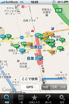 例えば、オロの最寄り駅である目黒駅周辺で「検索」ボタンを押せば、店の位置と大体の価格を示す印をマップ上に表示してくれる。