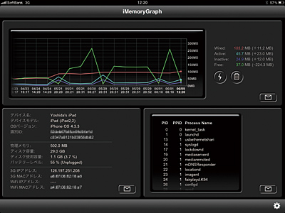 ただ、そんなiPadでも「不満はある」という。例えばウェブ閲覧で画面を多く開いたり、アプリを多く立ち上げると、メモリ不足で動作が重くなる。解消するには一度iPadの電源を入れ直す必要がある。そこでこのアプリ『iMemoryGraph』の登場だ。再起動することなくメモリを解放してくれ、その様子はグラフでリアルタイムに表示される。「メモリの解放は、今まで詰まっていたものをどかっと開通させる快感がある。今ではむしろメモリを解放する快感がアプリを使う目的となっている」とか。