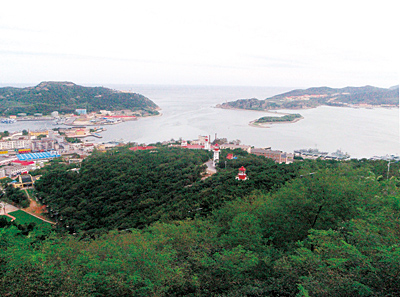 白玉山の展望台から旅順口を望む。湾の中央にある中洲は「虎の尻尾」の名がある