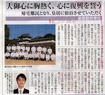 皇居に宿泊させていただいた勤労奉仕団の学生たちの記事