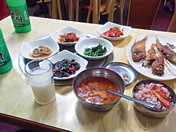 ▼女主人は、私と同世代の先客を指差した。その人は「どこから来たの」と日本語で話しかけてきた。今度はこちらがびっくりする番だ。「東京です。マッコリはありますか」「今、買いに行ったよ」「この店にはマッコリを置いてないんですか」「前の客が全部飲んだからね」。ようやく事情が呑み込めた。使いに出ていた店主がペットボトルに入ったマッコリを2本、テーブルに置いた。女主人はコップと先の丸いスプーンと銀色の箸を置いた。小魚のムニエルのようなものが4尾とおつまみが数皿出てきた。一杯飲んで、豆もやしに箸をつけた。うまい。