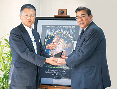 ▼英文の社名はマグネット・ラボラトリー、略して“MAG-LAB”。創立30周年を記念して、世界に向けたアニメ的なロゴマークをつくった。前に向かって今にも駆け出しそうな半人半馬の凛々しい男性と、その胴体に腰かけているのは穏やかに微笑む女性。天には星、地には樹木。「夢を実現したい人は来てください。ここにはそのフィールドがあります」。ドバイ、バングラデシュに続いて、近く上海にも会社をつくる計画があるそうだ。(BCN社長・奥田喜久男)