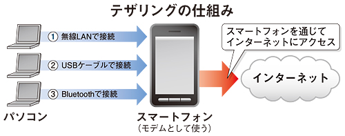 スマートフォンが備えている通信機能は、本来スマートフォン自体をインターネットに接続するのが一般的な用途だ。一方、テザリングでは、その通信機能を借用して、スマートフォンそのものではなく、スマートフォンを通じてパソコンなど他の機器をインターネットにつなぐ仕組みである。テザリングを使えば、ノートパソコンやタブレット、ゲーム機など、複数の端末をスマートフォン1台でインターネットに接続することが可能となる。
