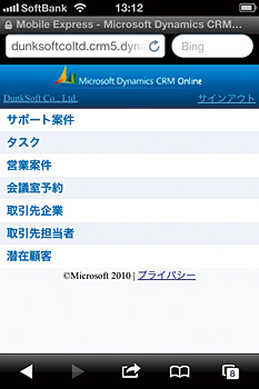 ダンクソフトの星野晃一郎社長がiPhoneで頻繁に使っているアプリケーションソフトは、日本マイクロソフトのクラウドサービスで顧客情報管理(CRM)機能の「Microsoft Dynamics CRM Online」だ。このソフトをiPhoneで利用するにあたっては、二つの方法がある。一つはiPhone向けに開発された独自アプリを使う方法。もう一つは、スマートフォンに最適化されたユーザーインターフェースのウェブサイトに、インターネットブラウザを通じてアクセスする方法だ。星野社長は、アプリではなく、ブラウザ経由でスマートフォン専用のサイトにアクセスして利用している。
