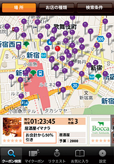 「イマナラ!時限クーポン」には、東京・大阪・名古屋とその周辺都道府県を中心に、時限クーポンを発行する約1万2000店の店舗が登録されている。ユーザーはこのアプリを使って、モバイル端末の位置情報機能を活用して現在地周辺の店を検索し、その店の時限クーポンを取得することができる。