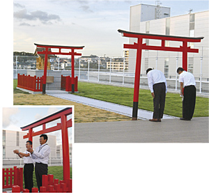 ▼阿部さんから「お出でになりませんか」とお誘いが入った。いそいそと出かけた。6階建ての真新しいビルには、「”マイ神社”があります。ご覧になりますか」と、阿部さん。私が神職修行をした身であることを知っておられる。「では、ご一緒にお参りしましょうか」。芝生を敷き詰めた屋上の中ほどに、赤い鳥居と小ぶりだがしっかりした造りの赤い祠がある。お稲荷さんだ。