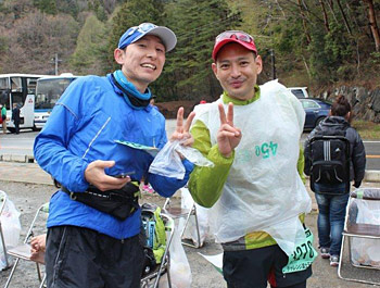 ▼100㎞ウルトラマラソンのその日を綴ってみると――。100km種目は朝5時のスタートだった。その時刻の御殿場は土砂降り。反対側も同じだ。1400名が参加し、BCNからは、スタートラインに近藤君と、中国事業を担当する伊達和久君の2名が立った。「スタート直前で、近ちゃんが握手を求めてきました」と伊達君。それから100kmの走りが始まった。2.5㎞ごとに標識がある。「そのたびに近ちゃんが時計を見て、タイムを伝えてくれるんですよ」。2.5kmを17分45秒で走る。「早過ぎます」「遅いです」と、そのつどペースを調整する。都合、39回の作業だ。これだけでもウルトラ技だ。