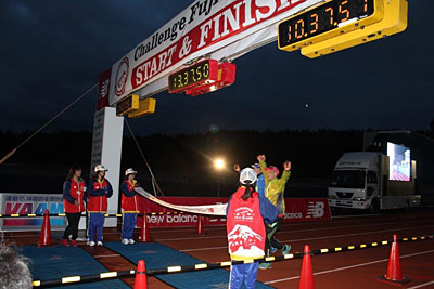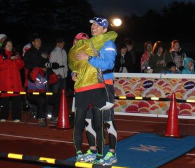 ▼休憩所のエイドステーションは5kmごとにある。「家族とは3回会いました。58kmを走った時点で、これからいつものフルマラソンを走るのかと思った時には、心も体も重かったです」。それでも家族の励ましでフルマラソンのスタートラインに立った。「そこからがつらかったです。一人だと絶対に走れなかった。近ちゃんはスゴイ」。そのスゴイ中身は二人だけの感動だ。「伊達君は、もう一度走るかい」「私はもう十分です。数年先のゴビ砂漠マラソンを狙ってます」。これと同じ質問を近ちゃんにした。「僕は、来年もう一度走ってみようかな。いえ、ゴビは走りません」。二人は並んでゲートをくぐった。13時間37分51秒。「ゴールして今度は私から抱きつきました」と伊達君。歩く姿はロボットだった。2013年4月21日は大切な想い出の日となった。なんて素敵なドラマなのだろう。(BCN会長・奥田喜久男)
