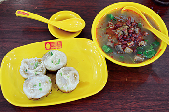「小楊生煎」は、上海を中心に約80店舗を出店しているローカルフードチェーンで、日本の旅行ガイドブックに取り上げられるほどの人気店。お店のイチ押しメニューは、店舗名にもなっている「生煎」だ。これは大きな鉄鍋で焼き上げた小龍包のことで、上海を代表するローカルフードの一つとして知られる。外側はカリッとした皮で覆われ、噛むと小龍包と同じように、包子の中からアツアツで旨味たっぷりの肉汁がじゅわ~っと溢れ出てきて、とても美味。「小楊生煎」に週2回ほど通っているというサイボウズ上海の鈴木孝充氏は、「上海で一番おいしい生煎を出す店。しかも安い」と高く評価する。生煎は、4個入りが6元(約100円)。鈴木氏は、これに辛酸っぱいスープと麺を合わせた「牛肉酸辣粉」(15元)をいつも一緒に注文しているそうだ。(道)
