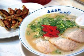 博多の繁華街を歩くと、いたるところに見かける屋台。長浜ラーメンの老舗「一心亭」も、ルーツは屋台だ。一心亭を紹介してくれたのは、大分市に本部があるハイパーネットワーク社会研究所の江原裕幸氏。タクシーの運転手に「おいしいラーメン屋」をリクエストしたところ、案内してくれたのが一心亭だったという。以来、博多に足を延ばしたときの定番になっている。長浜ラーメンの特徴は、とんこつスープに細麺、そして、長浜が発祥といわれる替え玉。一心亭では、長浜ラーメンが490円で、替え玉が100円となっている。ちなみに、大盛りも100円プラス。どちらが得か気になるところだが、替え玉1回と大盛りは麺の量が同じとのこと。とはいえ、ご当地ということもあり、替え玉を選ぶお客さんが多いそうだ。一杯目は、とんこつのワイルドな旨味が凝縮したスープを堪能。替え玉は、紅生姜や辛子高菜などを加えて、新たな一杯として楽しみたい。(亭)