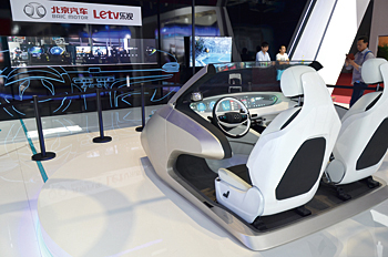 ITを活用したスマートカ―を展示する企業もみられた。とくにIoTの自動車版「IoV(Internet of Vehicle)」が中国では注目されていて、自動車メーカー各社がIT企業と手を結んでいる。例えば、インターネット企業の楽視網(LeTV)と提携している北京汽車は、スマートカ―のデモ機を展示。大型モニタを通じての操縦で、将来は無人運転やスマートナビ、現在地測定などができるようになるという。