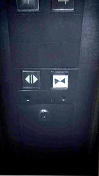 エレベータのドア開閉ボタン。老朽化で壊れたのだろう。右側の閉じるボタンが手づくりのものを使って修復されていた