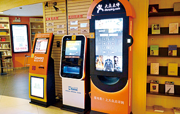 中国の映画館に初めて足を運んだ。チケット購入の窓口付近に、自動チェックイン機のようなキオスク端末が複数設置されていることに驚いた。それも、「格瓦拉@電影」「時光網」「大衆点評」「陶宝電影」「猫眼電影」など、複数の会社が設置している。