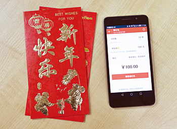 中国には、赤色の封筒にお金を入れて子どもに配る、いわば日本のお年玉にあたる「紅包」という慣習がある。最近では、オンライン決済を通して紅包のやりとりができるサービスも流行中だ。SNSアプリ「微信(WeChat)」では、2014年1月から紅包サービスを提供。ユーザーの中国人は、「グループ内のメンバー間で、金額をランダムに配布する設定ができるので、おみくじ感覚でおもしろい。遠距離の友人とも遊べるので、コミュニケーションにも役立つ」と語る。