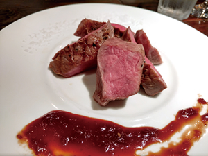 落ち着いた雰囲気でカウンター席もあり、一人でも入りやすそうなビストロだ。牛、豚、鶏、鴨、ラムなど、さまざまな肉料理を比較的リーズナブルに味わうことができる。看板メニューは、牧草のみで飼育された「グラスフェッドビーフ」のサーロインステーキ(写真)。低温で6時間~12時間かけて火を通すという独特の調理法で、「肉の旨味を最大限引き出すとともに、柔らかい食感に仕上げている」という。