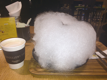 とはいえ、本当のクラウドではなく綿菓子をクラウドに見立てたもの。パンケーキの上にのっていて、クラウドの上にチョコレートの飛行機が飛んでいる。出された瞬間、「どこから食べればいいのだろう」と迷ったが、すかさず店員が「こちらの(温かい)チョコレートソースをかけて、お召し上がりください」。かけてみると、みるみるうちにクラウドが溶けていき、チョコレートと綿菓子のソースがパンケーキの上にかかる。全部は溶けないで、綿菓子だけでも楽しめる。「甘党」には絶品だ。(郁)