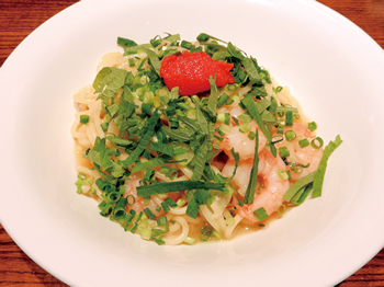 前田さんからランチで大人気と聞いていたのが、太めの生麺を使用しているパスタ(写真は「青じそと小海老のペペロンチーノ」)。もっちりとした弾力のあるパスタにソースがよくからみ、かみしめるごとに口の中においしさが広がる。また、北海道の契約農家から届けられるジャガイモをその場でカットして揚げたフライドポテトも人気メニュー。アンチョビバターやトリュフ塩など7種類の味付けから選ぶことができる。本紙記者のランチ/仕事帰りの“行きつけ”にも新たな1店が加わった。(螺)