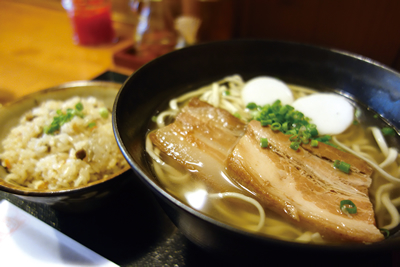 沖縄県情報産業協会の根路銘勇会長は、知る人ぞ知る“沖縄そば”通。県内の名店をくまなく食べ歩いているというが、出張で沖縄を訪れた記者の「那覇市内でオススメの店を紹介していただくとしたら」というリクエストに応えて教えてくれたのが、沖縄県庁や観光の定番スポットである国際通りからも近い「沖縄茶房 すーる」だ。古民家を改造したという赤い瓦屋根が特徴的な店構え。店内は「茶房」の名のとおり、落ち着いてゆったり過ごせるカフェといった雰囲気だ。「そばだけでなくジューシー(炊き込みご飯の一種で沖縄県の郷土料理)も食べてみるべし」という根路銘さんの指導?に従い、沖縄そばとジューシーのセットメニューである「そばセット」を注文するのが吉か。化学調味料をまったく使っていないというスープは、あっさりではあるが十分に旨味が感じられる。