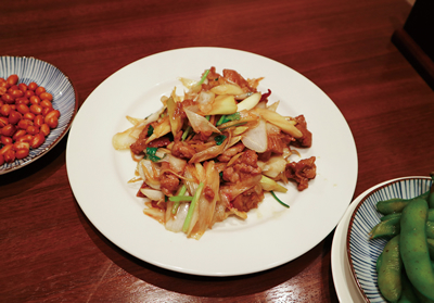 羊肉を使った料理がおすすめで、写真は羊肉とねぎの炒め物(葱爆羊肉)。羊肉独特の臭みが苦手という人もいるが、香辛料のクミン(孜然)をほどよく使うことで、ぐっと食べやすくなるのだそうだ。(寶)