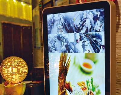 食の安全への関心が高まる中国。最近では、客側が店を監視できる仕組みを導入する飲食店が増えている。上海高島屋の飲食店では、入り口付近に店を紹介するデジタルサイネージを配置しているが、その上部には厨房の様子が映し出されている。これによって、客は店舗の衛生状況を把握することができるし、厨房スタッフの不正行為防止につながるというわけだ。