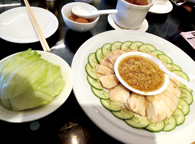 ジンジャーチキンとは、蒸した鶏肉ときゅうりのスライスに、ジンジャーソースを加えて、レタスで巻いて食べるもの。やわらかくてジューシーな蒸し鶏と、独特なジンジャーソースの風味に、やみつきになってしまう。