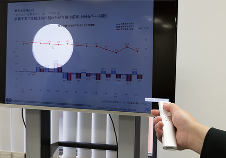 Spotlightを使うことで、プレゼンの何が変わるのか。通常は赤い点のみだが、Spotlightは丸で囲む「円」のほか、円のまわりを暗くして目立たせる「強調表示」、円のなかをズーム表示する「拡大」の三つを備え、切り替えて使える。強調表示では、他の部分を隠すことで伝えたいメッセージが強調できるし、拡大では決算資料などの細かい数字が後ろの席の人までしっかりみえる。