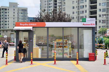 このコンビニ「繽果盒子(BingoBox)」では、入り口に表示されたQRコードをスキャンし、携帯番号を登録すると、ドアの鍵が解除されて入店できる。商品はお菓子屋や飲料、生理用品などを中心に取り揃えており、どの商品にもRFIDタグが添付されている。これをレジカウンターに置くと、自動的に購入金額が表示される。支払いはもちろん「微信支付」「支付宝」などのモバイル決済。お店には現金を置いていない。
