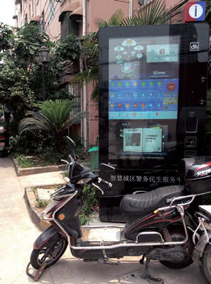 上海市内を散歩していると、各小区(住宅団地)に大きさ2mほどのデジタルサイネージが設置されていることに気づく。名前は「智慧城区警務民生服務平台」。スマートシティ建設の一環として、行政が導入を後押しているものだ。このサイネージでは、公共情報サービスとして、天気予報や空気汚染度、交通機関の運行状況を確認したり、パスポートの申請方法を閲覧したりすることができる。グルメ情報アプリ「大衆点評」も搭載されていて、近隣の人気店を調べることも可能だ。