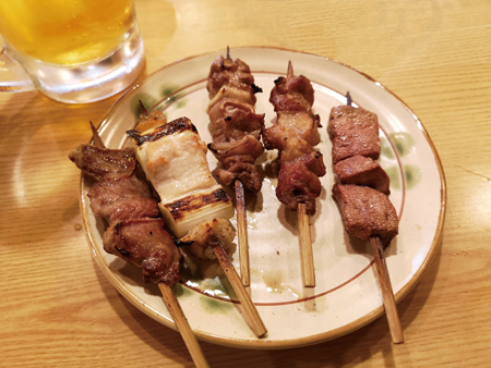 看板メニューはおまかせの焼き鳥盛り合わせで、もつ焼き中心の5本または10本セットが基本。タワー並みに積み上がったキャベツや、焼き加減が絶妙なジャガバターも名物。一人でもグループでも、仕事帰りの一杯を気軽に楽しめるコストパフォーマンス抜群のお店だ。(螺)
