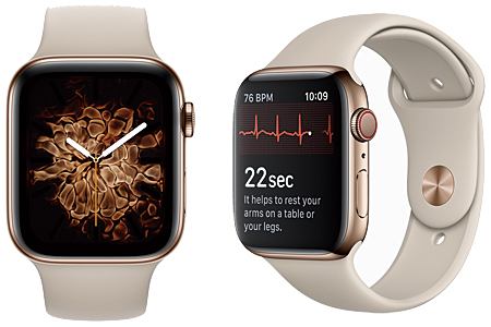 4世代目となり、デザインと設計を一新。ディスプレイは40/44mmに大型化したが、交換バンドは、従来の38/42mm向けのものがそのまま使える。処理速度は従来のSeries 2/3より向上。新たに心拍センサー、電気心拍センサー、転倒検出を追加し、Digital Crownにタッチするだけで心電図を取ることができる。