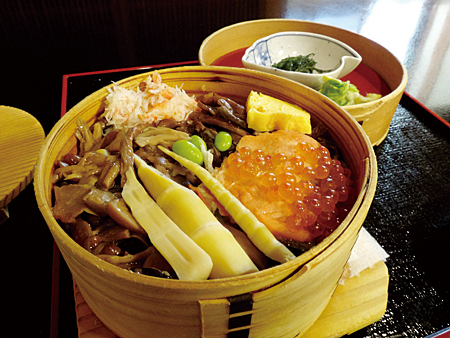 会津名物の一つが「わっぱ飯」。わっぱとは、スギやヒノキなどの薄板を曲げて作る弁当箱のことで、その昔、山人たちが愛用していたという。このわっぱに会津米、舞茸、しめじ、なめこ、磐梯竹、ぜんまい、蟹、鮭などの具を入れて蒸し上げたのがわっぱ飯だ。会津若松市内でわっぱ飯をいただける有名店が料亭・田季野だ。250年前に陣屋を移築した歴史ある建物で、黒々とした柱や梁に趣がある。