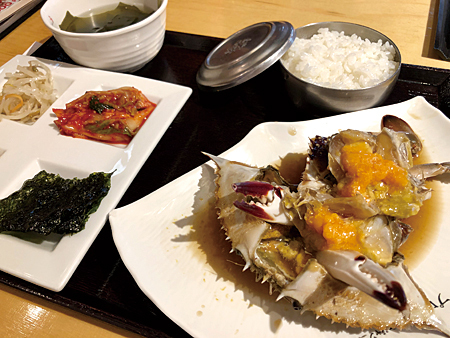 おすすめは店名にもあるカンジャンケジャン(渡り蟹の醤油漬け)だ。4400円とランチにしては高額だが、実際に口にしてみると値段にも納得する。特に濃厚な旨味と塩味が凝縮された蟹みそに、ご飯が止まらない。