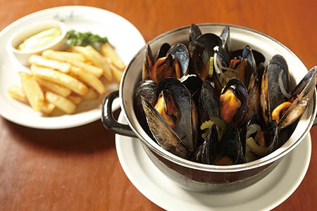ベルギーで修業を積んだ堀込さんは、1987年に店をベルギー料理専門の「シェ・ミカワ」として再オープン。現在は息子さんとともに厨房で腕を振るう。名物はムール貝で、ポピュラーな「白ワイン蒸し」(写真)のほか、「エスカルゴ風」「トマトソースとチーズ」など複数のメニューを用意。また、ベルギーの代表的な郷土料理「カルボナード」(牛ほほ肉のビール煮)も外せない。そしてベルギーと言えば個性豊かなビール。常時20種類以上を揃え、それぞれの銘柄に合った料理とのマリアージュを楽しめる。(螺)