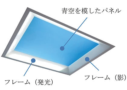 同社が2020年10月に発売する照明器具の名称は「misola(みそら)」。室内空間にあっても、開放的で奥行きのある青空と自然な光を表現する新しい照明だ。フレーム部の三面を光らせ、残り一面を影のようにすることで、太陽光の自然な差し込みを演出。明るさは一般的な照明器具と同等レベルを確保している。
