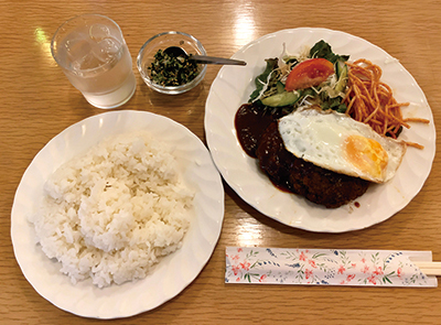ランチメニューのハンバーグは、デミグラスソースと和風ソースから選べる。ほかにも唐揚げやメンチカツ、豚しゃぶ、ロールキャベツなどがあり、「いずれもガッツリ系で満腹感が味わえる」とのこと。また、プラス100円でコーヒーか紅茶がついてくる。