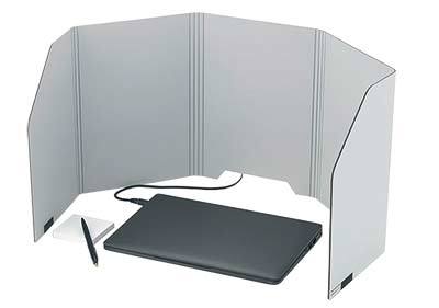 5面のパネルで構成し、使用するスペースの広さに応じて幅を調整できる、折り畳み式卓上パーティション。広げて置くだけで簡単に設置でき、高さはコンパクトタイプが310mm、ハイタイプが450mm。素材は軽くて丈夫な3層発泡PP。下部に2カ所のシリコンゴム製の滑り止め付き。ケーブルが通せる溝もついている。折り畳み時は、コンパクトタイプでA4ファイルと同等のサイズに収まるので、持ち運びもしやすい。